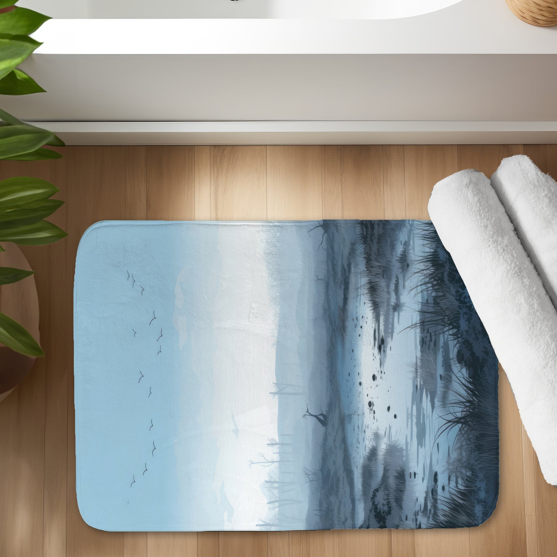 Swampy lands - Transform your bathroom into a serene oasis with our Blue bath mat, designed to evoke the tranquil beauty of wetlands. Crafted from ultra-soft, absorbent material, this bath mat provides both comfort and functionality, ensuring you step out of the shower onto a plush surface. The calming blue hue adds a refreshing touch to your home decor, making it perfect for any style, from modern to coastal.