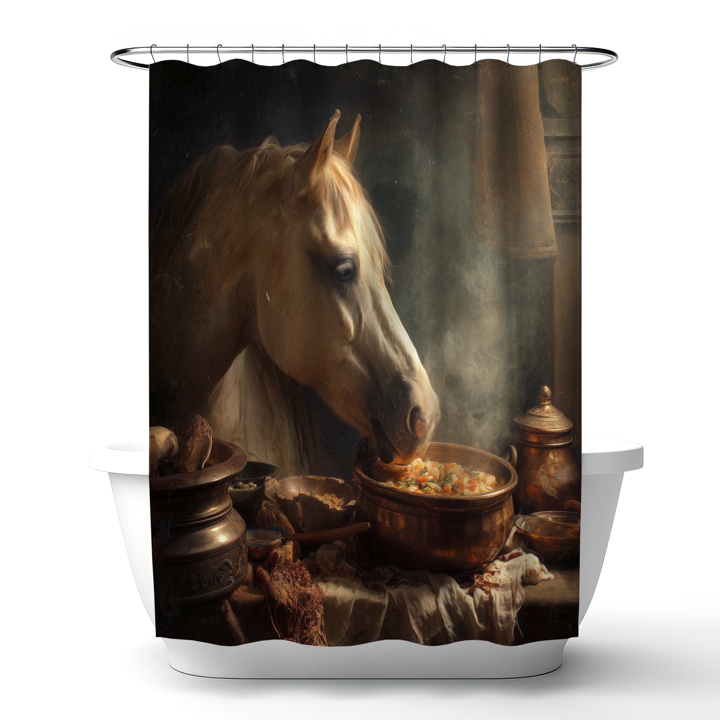Transform your bathroom into a stylish retreat with Horse on soup. Ideal for horse lovers or anyone looking to make a statement, this shower curtain is the perfect blend of functionality and artistic flair. Upgrade your home decor today and enjoy a luxurious bathing experience that reflects your personality and style. Perfect for gifting or personal use, this shower curtain is a must-have for any modern home.