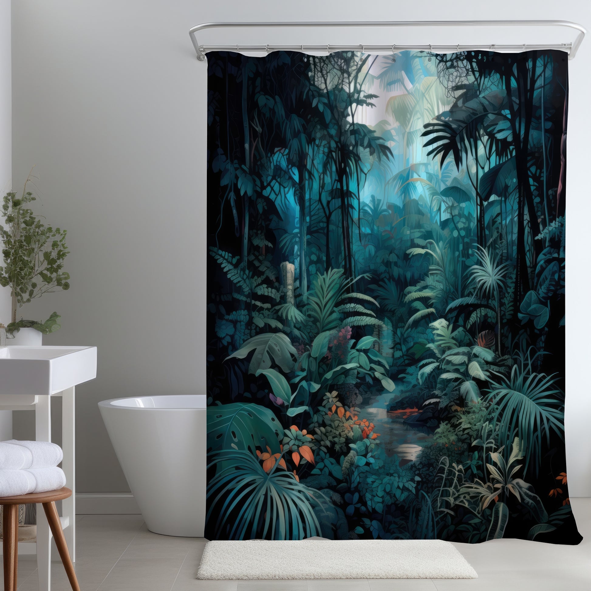 Deep in the jungle is a stunning turquoise shower curtain that transforms your bathroom into a vibrant oasis. Made from high-quality, water-resistant fabric, this shower curtain features an eye-catching jungle design that brings a touch of nature indoors. The rich turquoise hue adds a refreshing pop of color, making it perfect for modern and tropical-themed home decor.